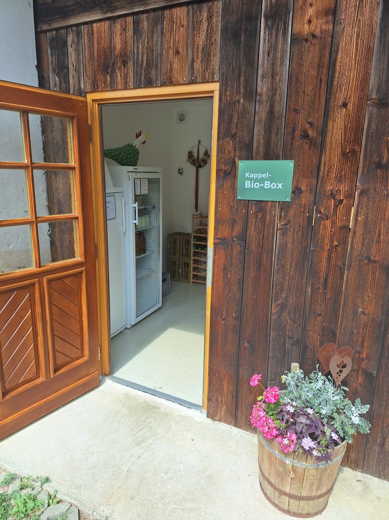 Als Zusatzangebot zum Hofladen gibt es die Kappel-Bio-Box bei uns am Hof, wo rund um die Uhr in Selbstbedienung Rohmilch, Naturjoghurt, Eier, Apfelsaft, Gebäck, Getreide, Mehl und teilweise auch Topfen und Kuchen geholt werden können.