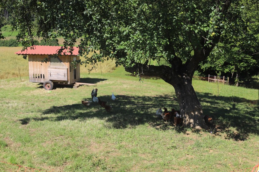 Wir haben jedenfalls eine Freude mit unserem mobilen Hühnerstall. Es macht Spaß, sich immer wieder neue Standorte zu überlegen und den Hühnern zuzusehen, welche Freude sie damit haben. Denn: bevor das Gras weg ist, kommen sie schon wieder auf einen neuen Platz. Weil sie ja mobil sind.