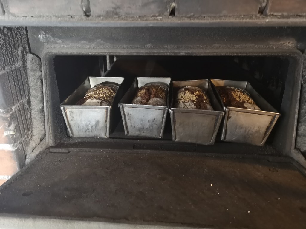 Wir haben einen Holzbackofen, der mit Schamott ausgekleidet ist (dieser speichert die Wärme und gibt sie langsam ab). Der Holzbackofen wurde bereits 1977 gesetzt und ist bis zum heutigen Tag das Herzstück der Backstube. Daneben gibt es noch zwei große Elektroöfen, die mit unserem Sonnenstrom betrieben werden und einige weitere hilfreiche Backgeräte. Am Backtag wird der Holzbackofen um drei Uhr früh eingeheizt. 19 kg Holz und ein Sack Hackgut sorgen dafür, dass die richtige Temperatur erreicht wird. Genauigkeit ist beim Brot backen alles, entscheiden doch kleine Veränderungen über das Ergebnis. Nach fünf Stunden Aufheizen ist die Wärme in den Schamottsteinen gespeichert und das Brot kann eingeschossen werden. Rund eine Stunde ist das Brot im Holzofen – dadurch entwickelt sich eine wunderbare Kruste und das Brot erhält einen wunderbaren und einzigartigen Geschmack.