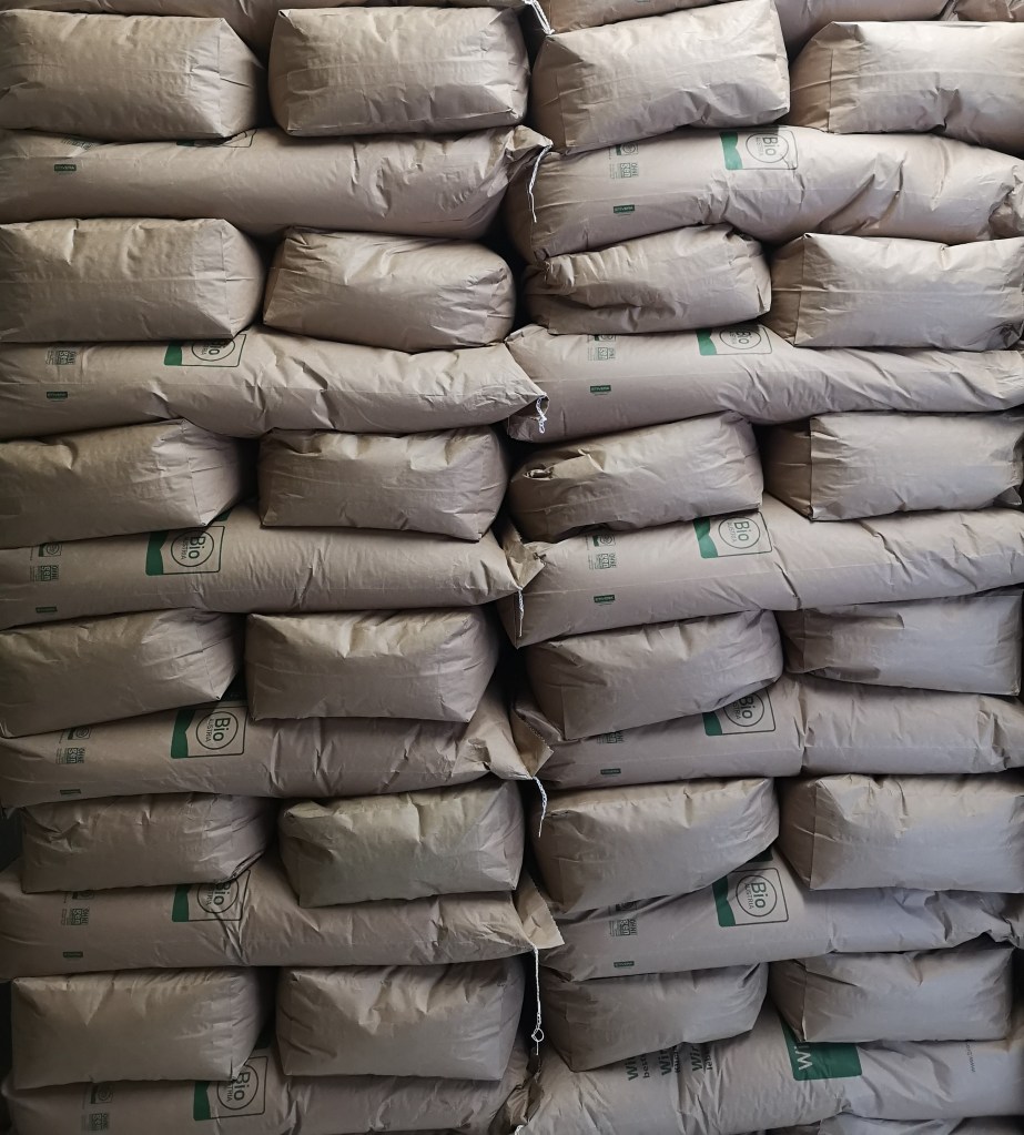 Und zwar buchstäblich, wenn es in die Erde gesät wird. Das passiert in der Zeit um Anfang Oktober. Bei uns wachsen Roggen und Dinkel in einer Fruchtfolge bis zur Ernte im Juli auf unseren Äckern. Wir verwenden Sorten, die nicht auf Ertrag getrimmt, sondern an den Standort angepasst sind und gute Backeigenschaften haben. Beim Dinkel ist das die Urdinkelsorte „Ostro“ und beim Roggen der „Amilo“. Nach der Ernte wird das Getreide nachgetrocknet, gereinigt, der Dinkel noch entspelzt und dann bei uns eingelagert. Seit einigen Jahren im Kühlraum – eine Auswirkung der Klimaerwärmung übrigens, da die ungekühlte Lagerung zu schädlingsanfällig geworden ist.