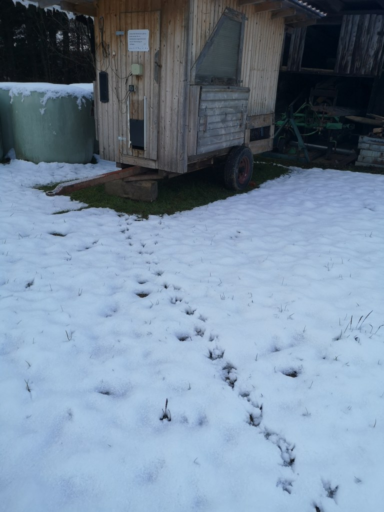 Die Spuren im Schnee helfen bei der Aufklärung des Falls. (Diese Henne wollt unbedingt vom Winterstall in den mobilen Hühnerstall, um ihr Ei zu legen)