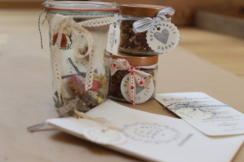Glas, Papier, getrocknete Pflanzen, Stempel…