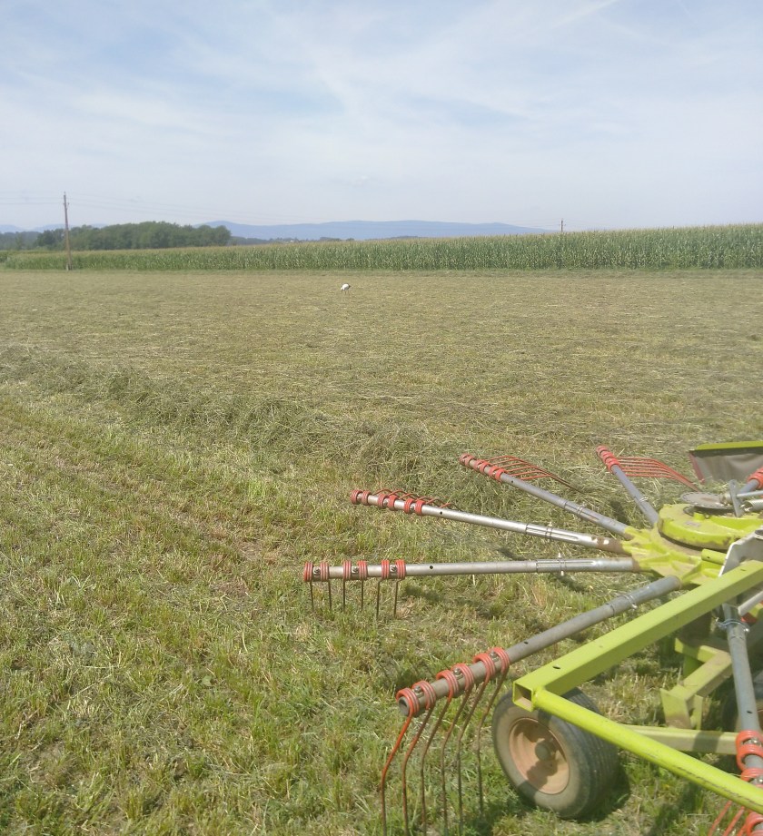 Vorheriges Bild Nächstes Bild IMG_20190717_112154 Beim Schwaden wird das Futter reihenförmig zusammengelegt, um es leichter ernten zu können.
